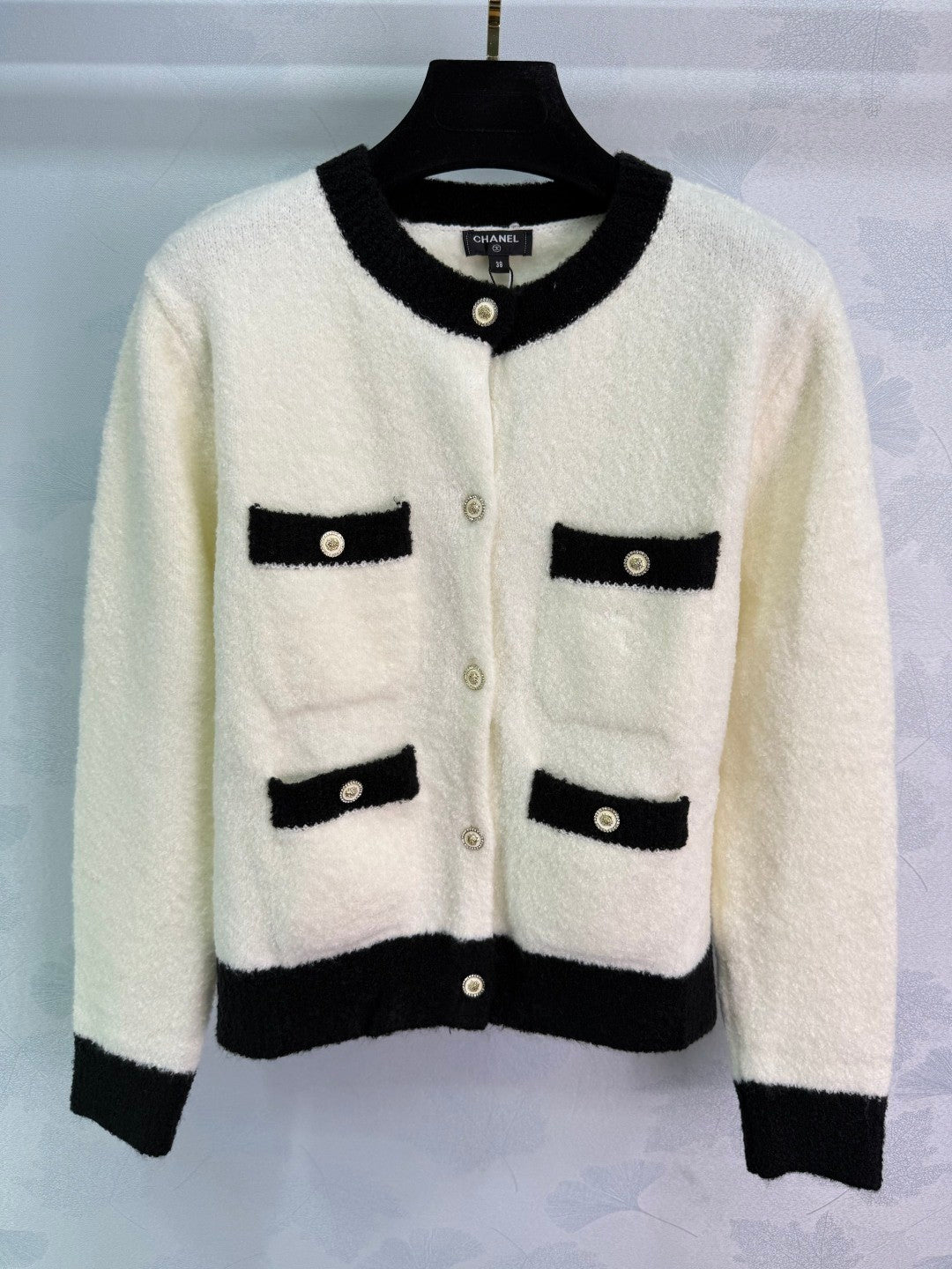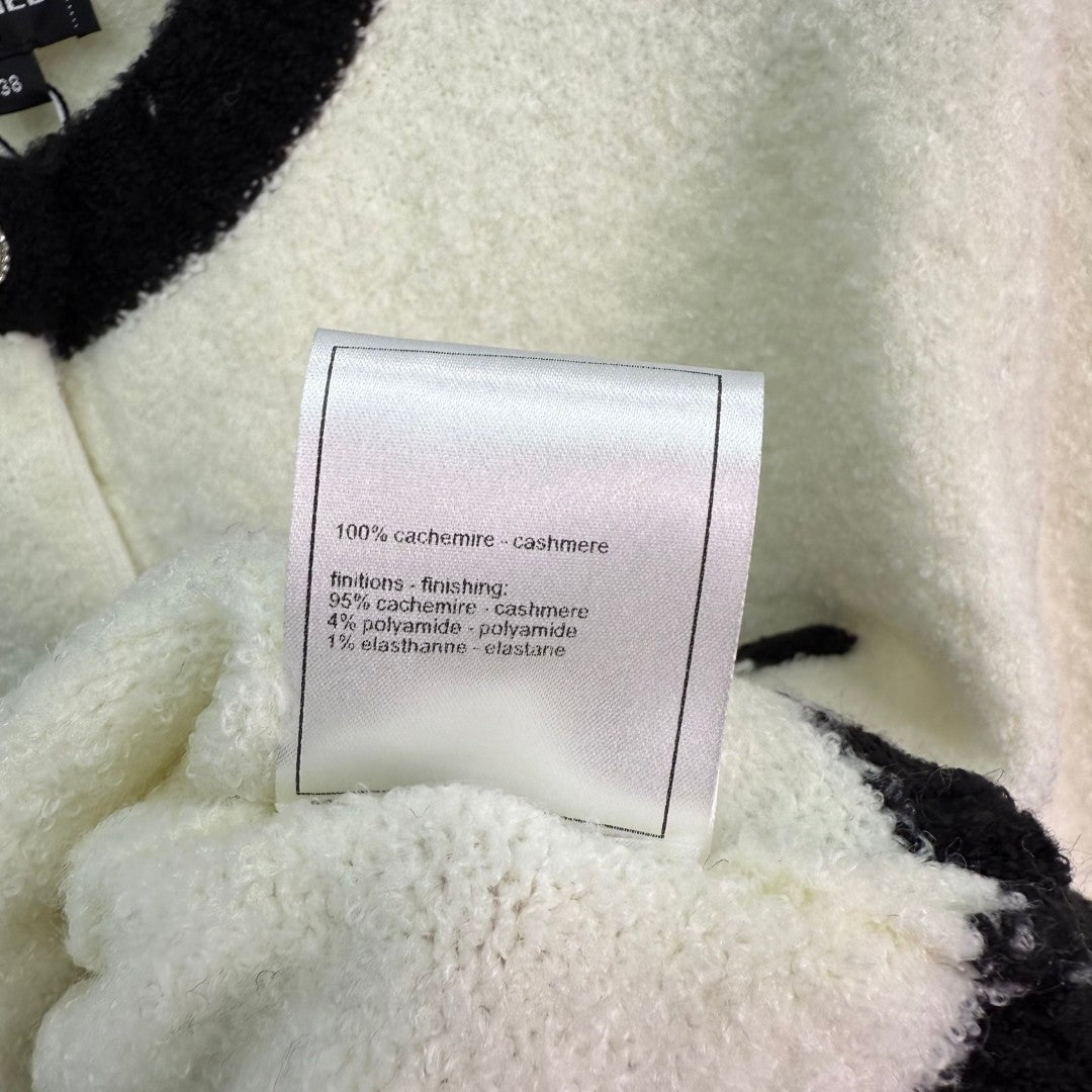 New knitted long-sleeved cardigan for early fall 2025! Custom cashmere knit for a comfortable, soft, and delicate look. Symmetrical pockets create a rich, layered look. Black and white silhouettes create a striking contrasting color scheme. Embellished with Chanel-inspired buttons, highlighting the brand's signature style. The garment's fine, dense texture creates a vintage-inspired look, adding an elegant touch to the upper body and showcasing a refined, Western-inspired feel.