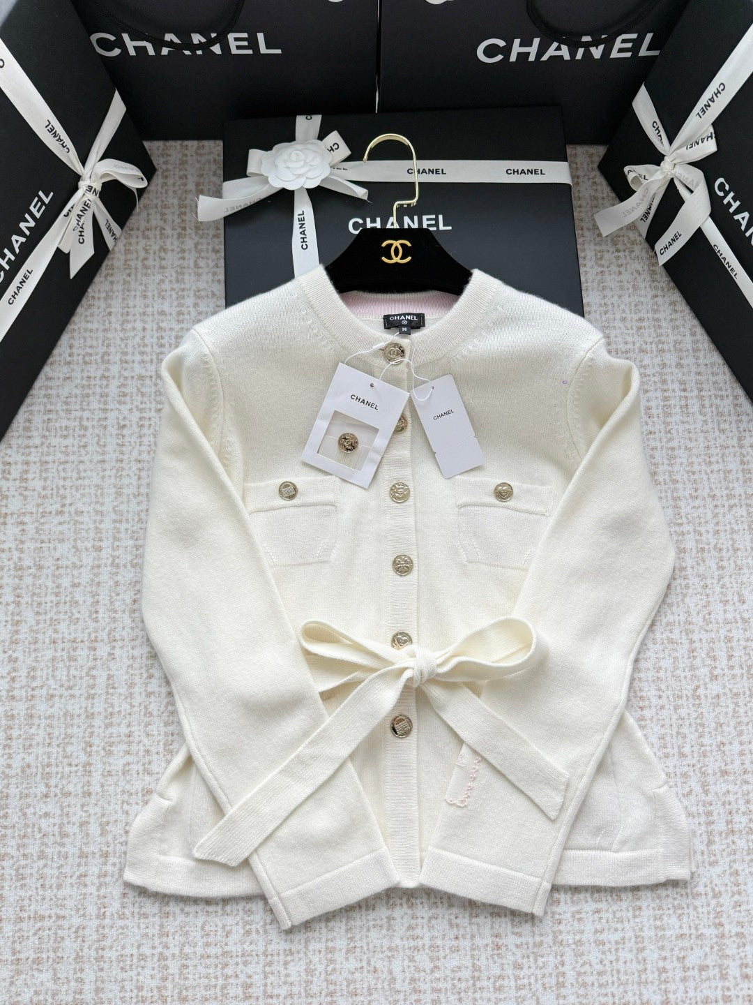New arrival for Fall/Winter 25, a minimalist two-tone collared long knitted cardigan! A tribute to the classic Chanel four-pocket design, it exudes a youthful and playful girlish charm! Custom-dyed cashmere yarn is premium, comfortable, and soft! Round neckline, three-dimensional tailoring, fine crochet texture throughout, and contrasting color threaded edging throughout. A relaxed and elegant look. The rhinestone buckle and bow tie on the chest easily highlight the detailed texture. Double C metal buckles embellish the top edge of the pockets. Exquisite and stylish. Perfect for layering and mixing. It can be stylish or hot, and fashionable and casual.