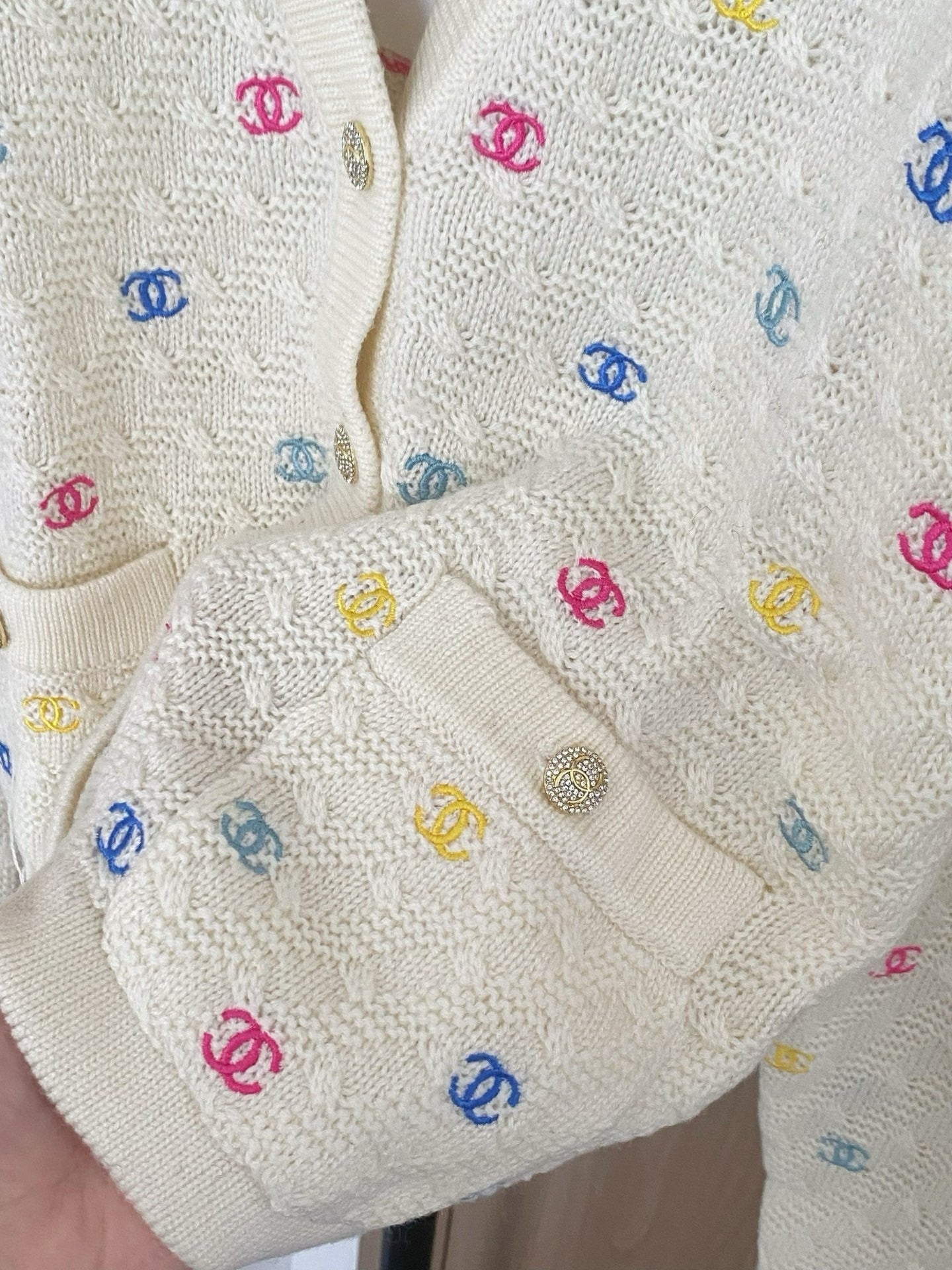 New for early fall, this colorful, logo-embroidered, double-C long-sleeved V-neck cardigan features a vibrant macaron color scheme and a youthful, youthful vibe. The signature single-row buttons add a touch of luxury and a stylish accent. This classic silhouette is versatile and a must-have for every woman!