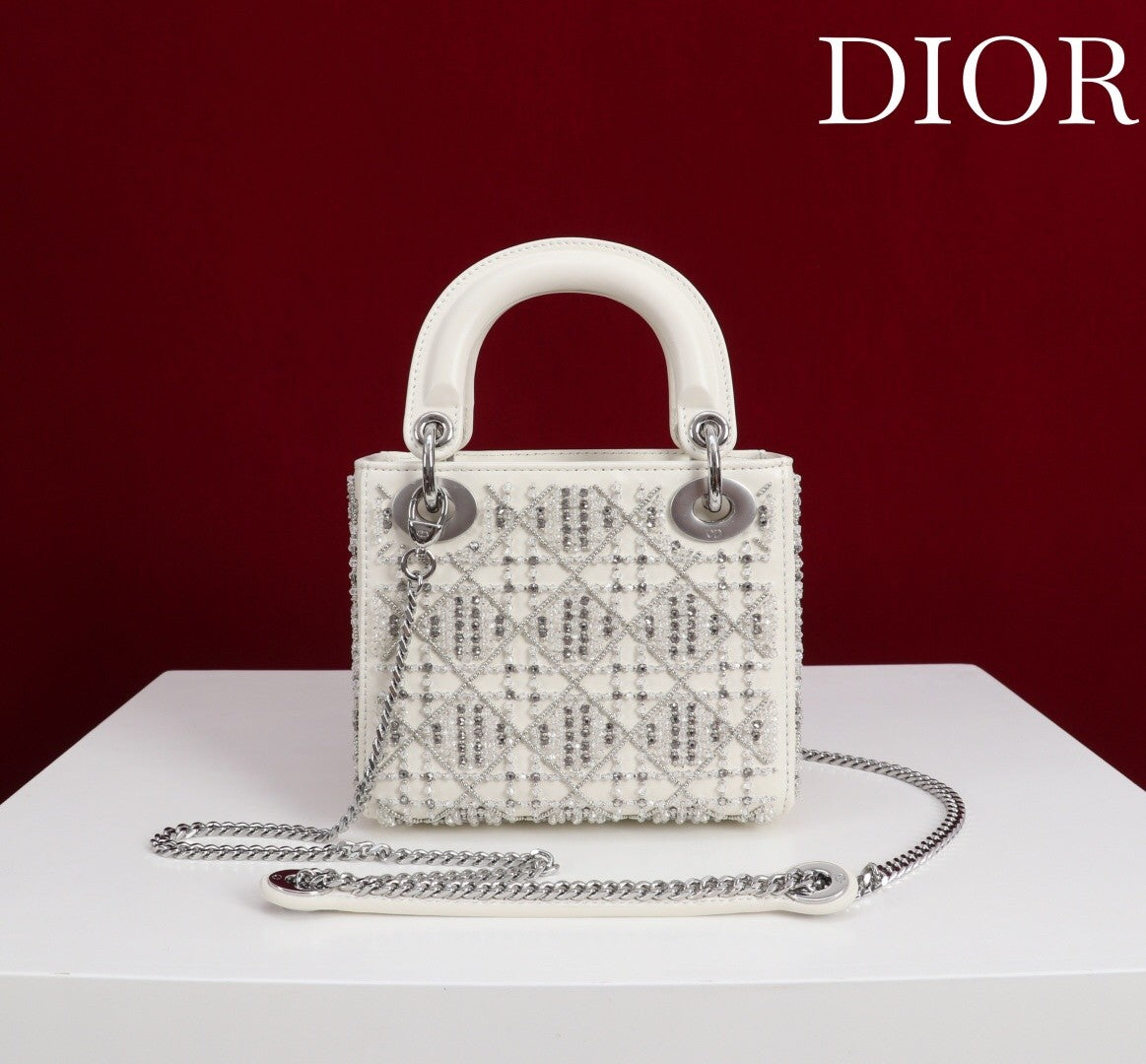 Three-grid embroidery with white silver diamond beads, lined with sheep sinew, and a delicate rattan grid pattern embellished with silver bead and diamond embroidery, highlighting exquisite craftsmanship and elegance. A silver charm with a light white enamel finish adds a touch of agility to the exquisite silhouette. This miniature style features a detachable chain shoulder strap, allowing it to be carried by hand or worn cross-body, making it an ideal companion for evening wear. Detachable chain shoulder strap, interior zippered pocket
